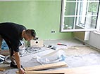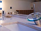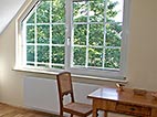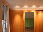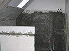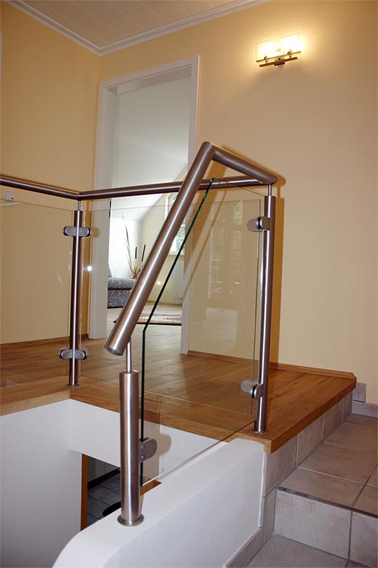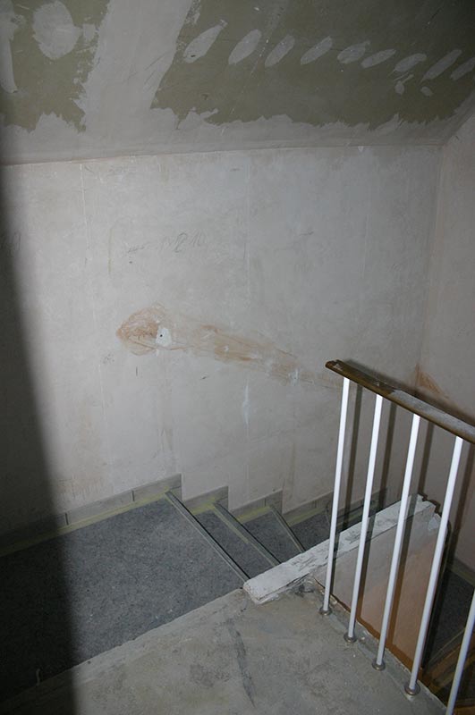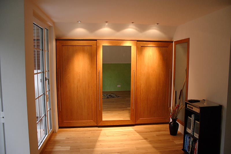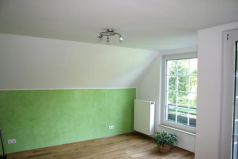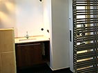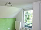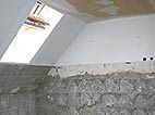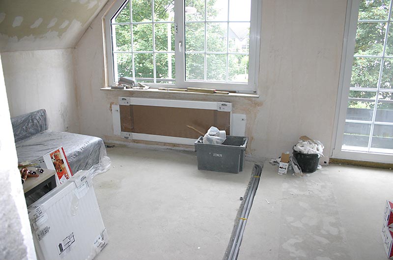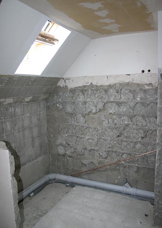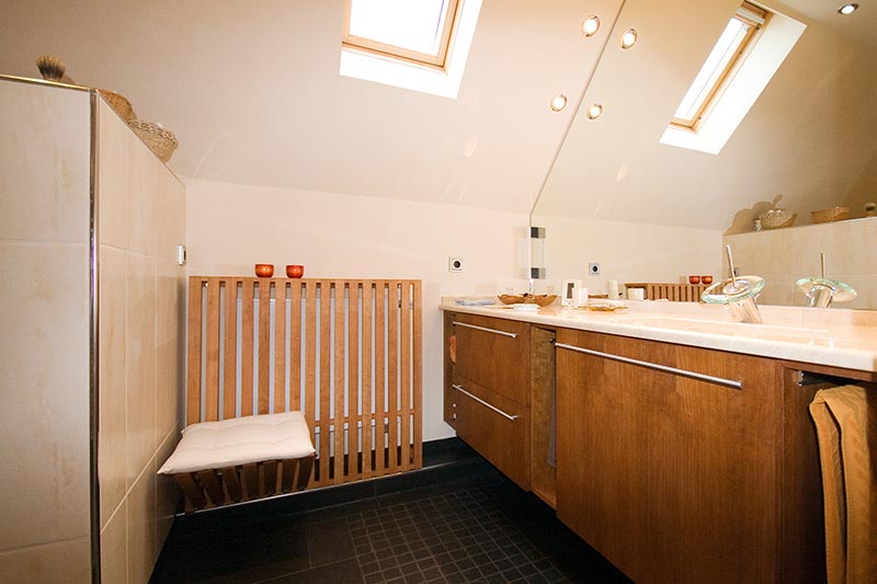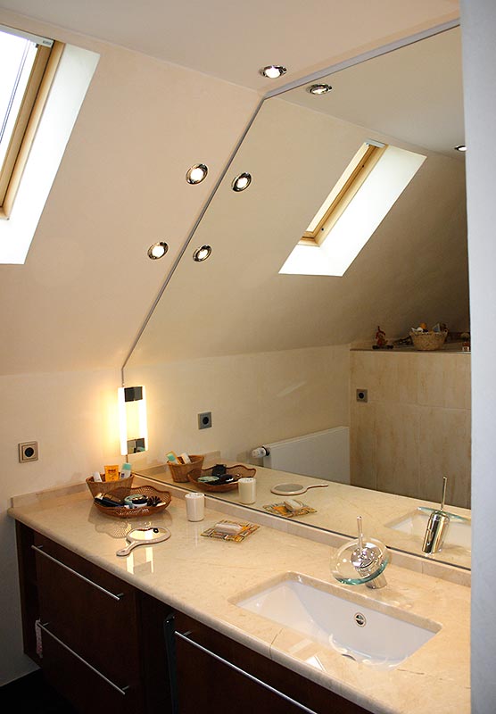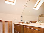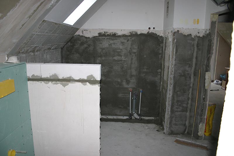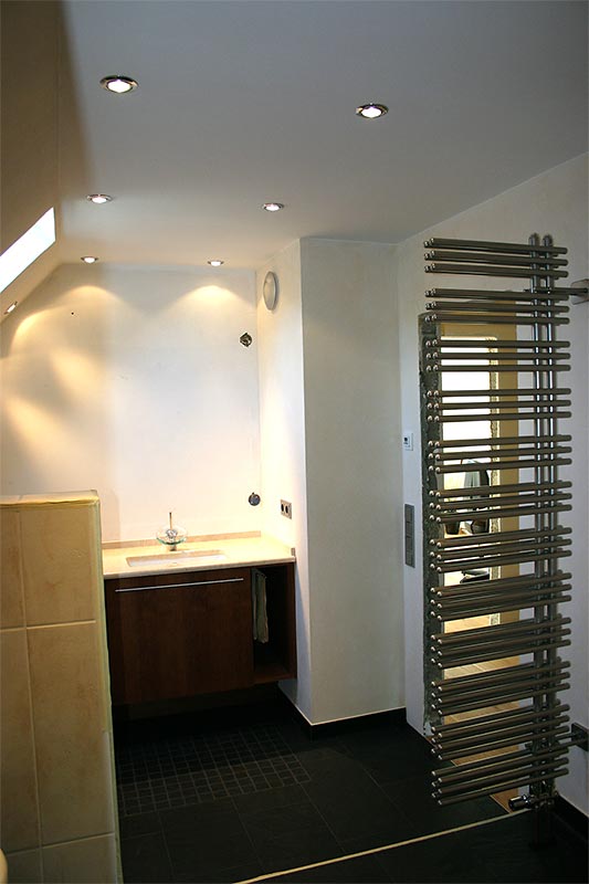 Dachgeschoss-Umbau eines Einfamilienhauses mit Badezimmervergrößerung, ebenerdige Dusche sowie begehbarer Kleiderschrank. Wandausschnitt mit satiniertem Glas vom Bad zum Ankleidezimmer. Bei diesem Projekt war insbesondere die Koordination vieler verschiedener Gewerke und die Qualitätskontrolle eine große Herausforderung.